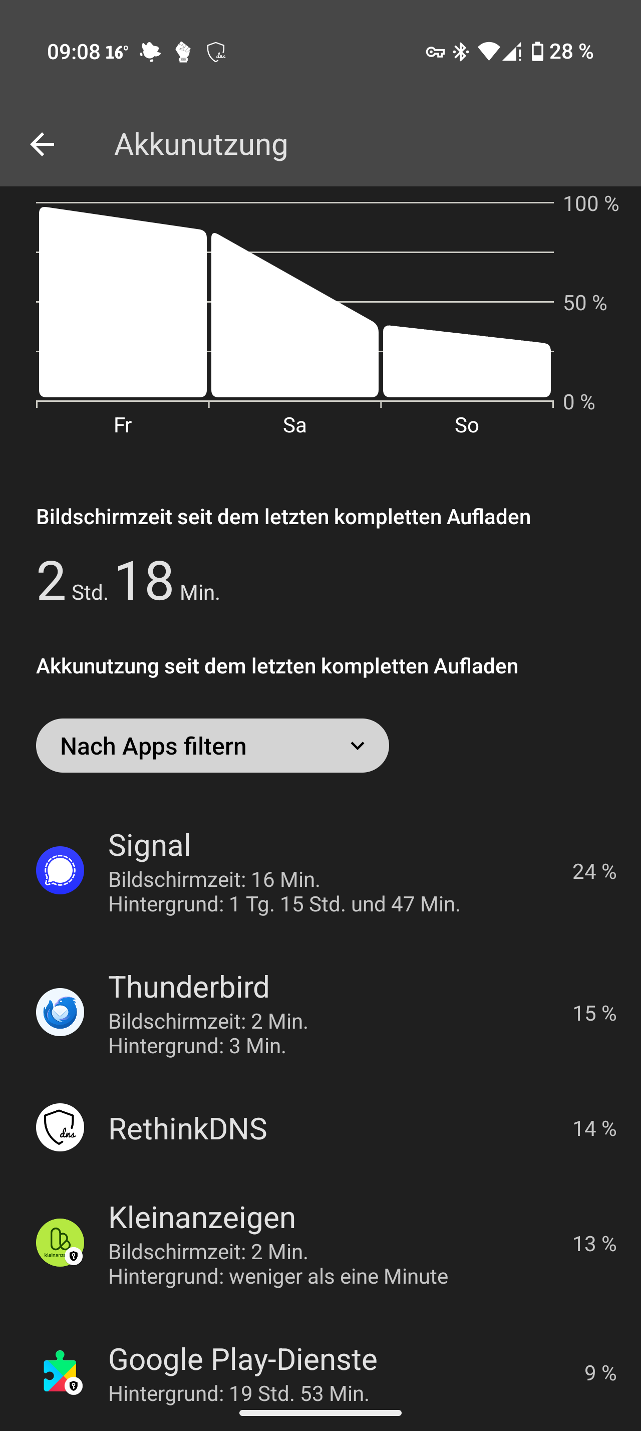 Bin mal gespannt, wie es sich weiterhin verhält aber ich glaube jetzt schon sagen zu können, dass der Verbrauch längst nicht so hoch ist wie bei meinem Fairphone 4 mit iodéOS und weitgehend denselben Apps (wobei ich einige davon jetzt im vertraulichen Profil installiert habe, welches ich normalerweise immer wieder schließe).