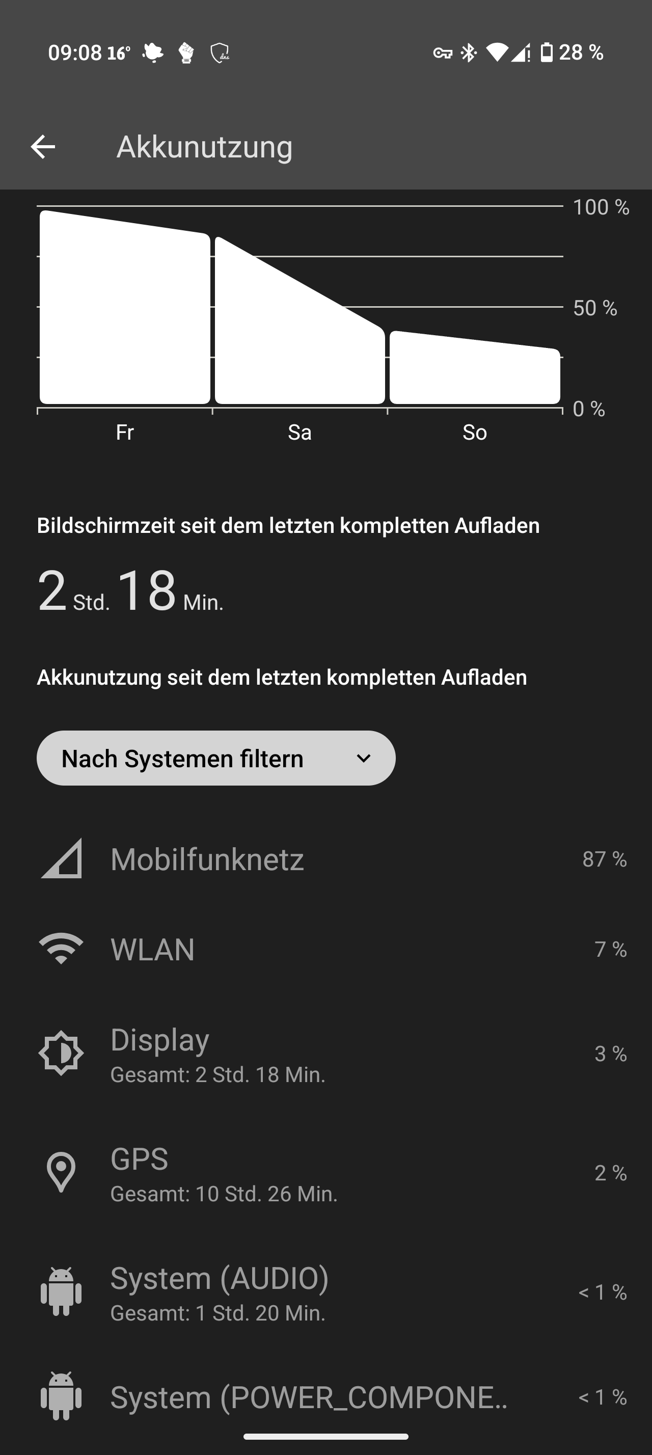 Was kurios ist: ich habe nun mal Freitag manuell auf 100% geladen, um eine Statistik für einen Zyklus explizit zu sehen. Und was soll ich sagen, seit ich das gemacht habe, hat der Akku plötzlich ohne weitere Änderungen deutlich besser durchgehalten. Hoffe, das bleibt jetzt so und war keine Ausnahme: