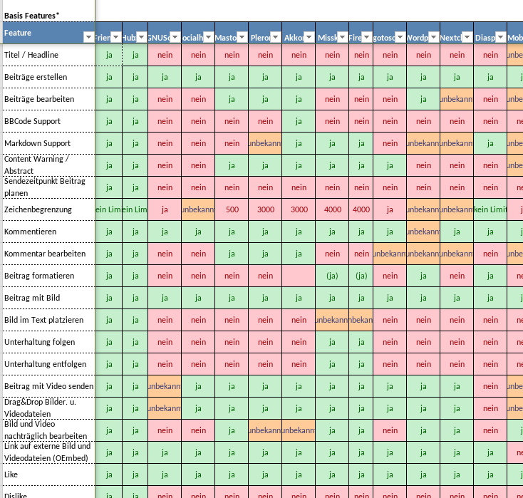 die Frage hab ich mir auch schon gestellt, aber weniger für technische Funktionen, sondern wofür die Dienste in der Praxis von den Leuten hauptsächlich genutzt werden (also z.B. Freunde finden, Blogging, Gruppen, Webseite-Ersatz, Unternehmensrepräsentation,… Technische oder weniger technische Themen…). Hier interessieren mich auch diaspora und streams.