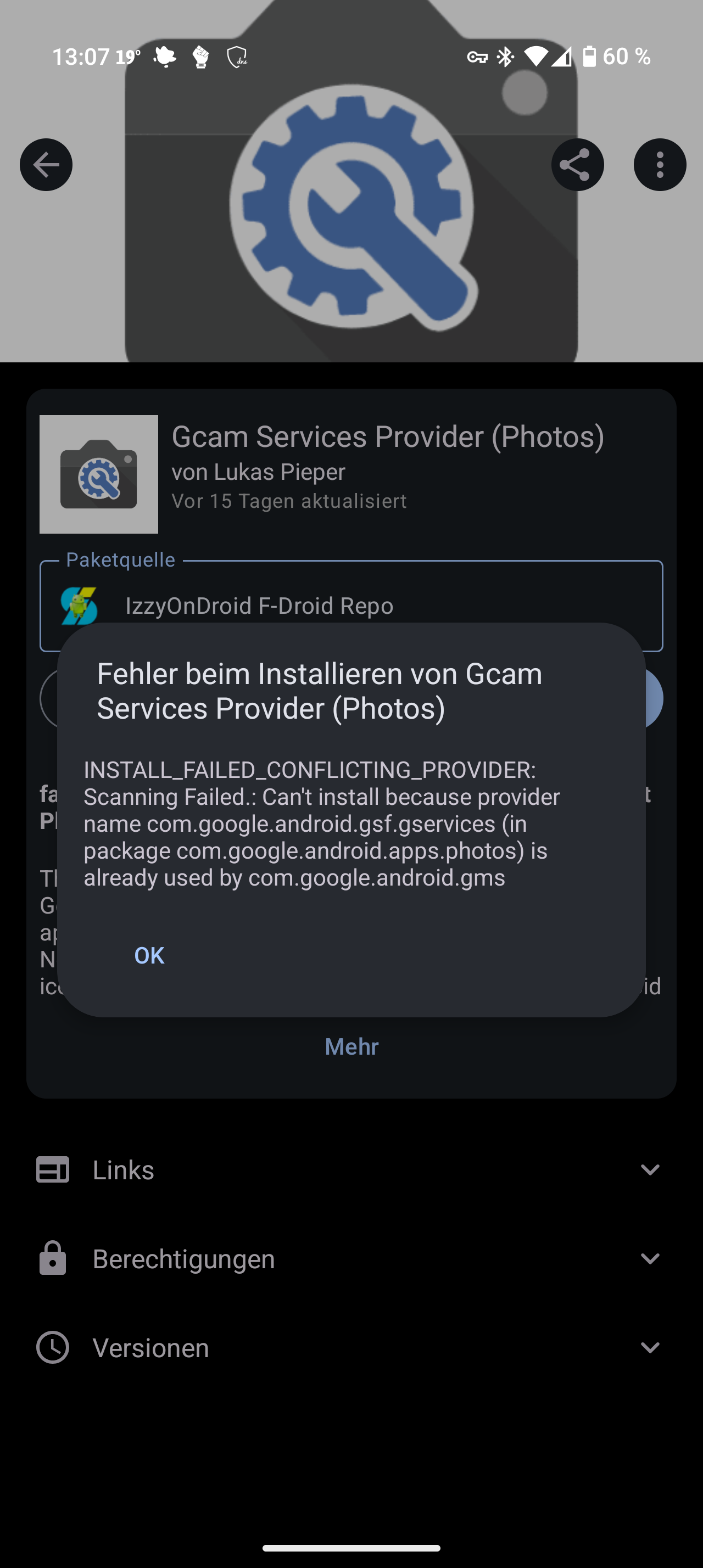 Tut es scheinbar, siehe Fehlermeldung oben. Ich habe und hatte nie Google Fotos installiert. Die alte Version der Gcam Service Provider Photos ist ja aber drauf, es ging also. Das Update hingegen schlägt fehl.