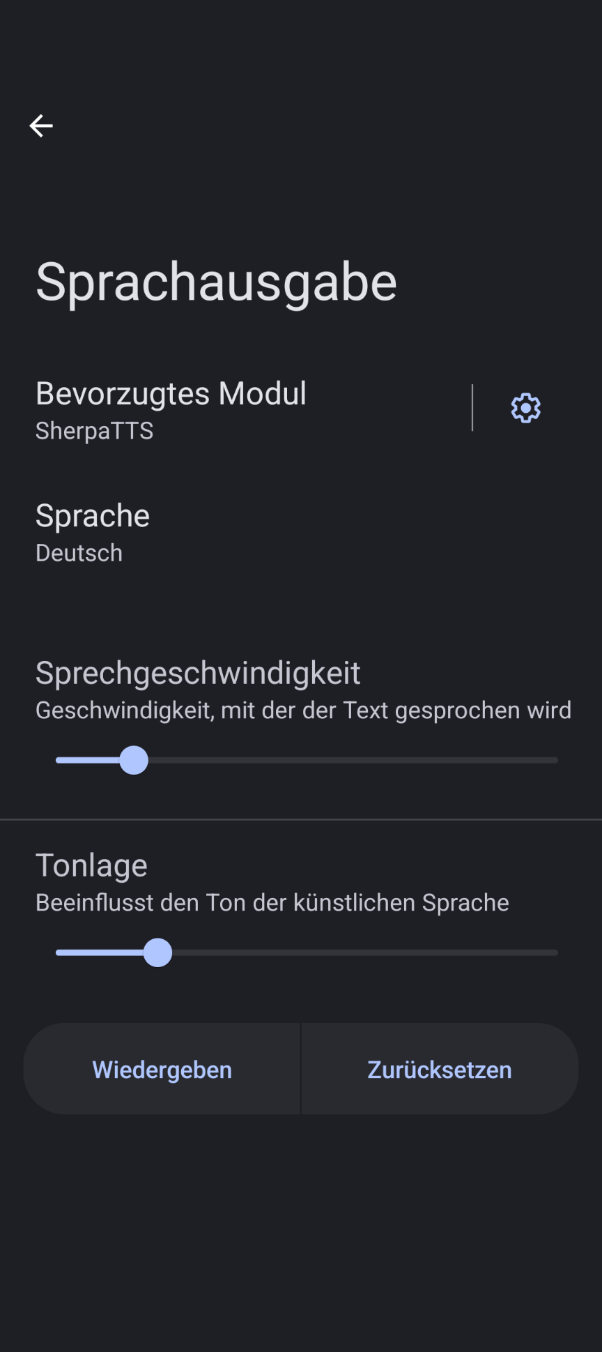 @Rainer1 : Wenn du mal vergleichen willst: So sollte das Menü Sprachausgabe aussehen, damit in Osmand+ die Sprachausgabe funktioniert. Steht bei dir SherpaTTS als bevorzugtes Modul drin?