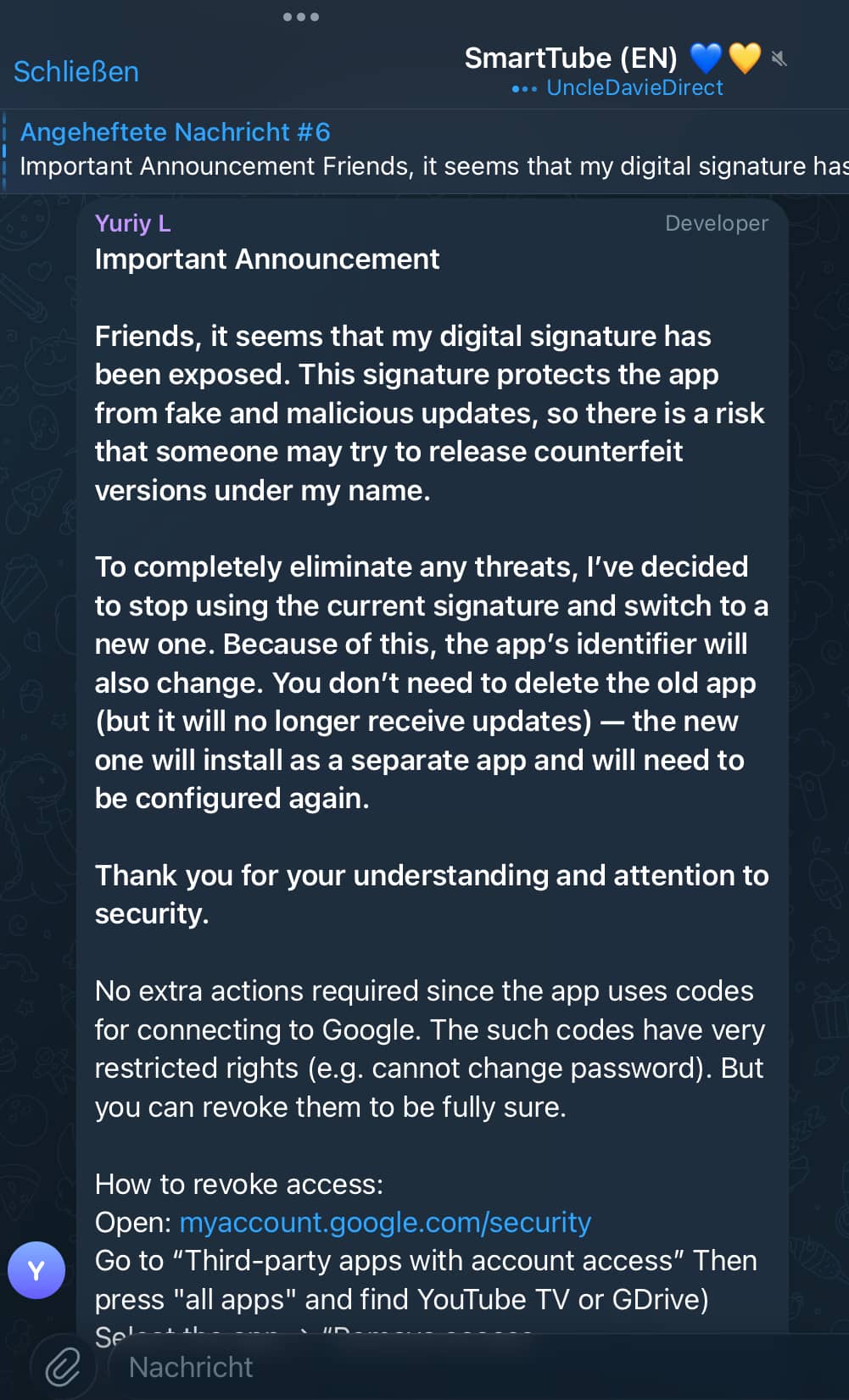Friends, it seems that my digital signature has been exposed. This signature protects the app from fake and malicious updates, so there is a riskthat someone may try to release counterfeit versions under my name.