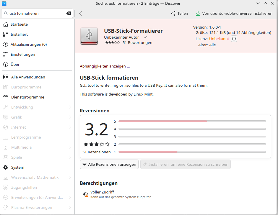 ich hätte eine Frage: ich habe mir auf mein Linux (Tuxedo OS) über deren Discover Store eine usb formatierungssoftware runtergeladen. stürzt beim starten direkt ab. Da der Urheber unbekannt ist, frage ich mich jetzt, ob ich mir da vielleicht ein Schadprogramm runtergeladen habe…?