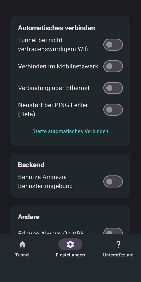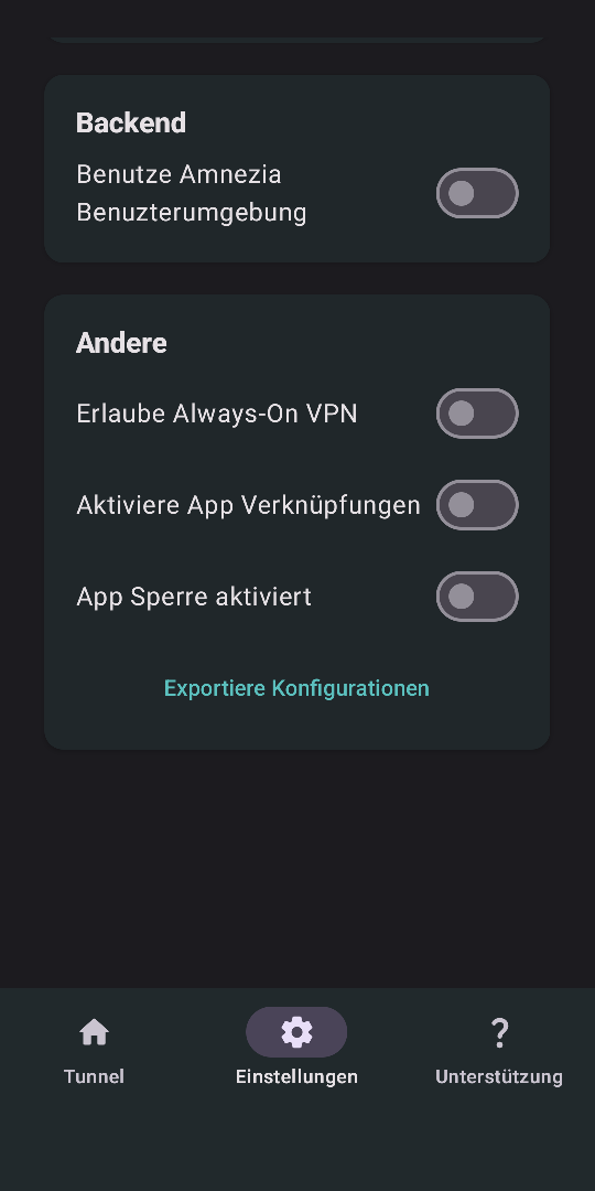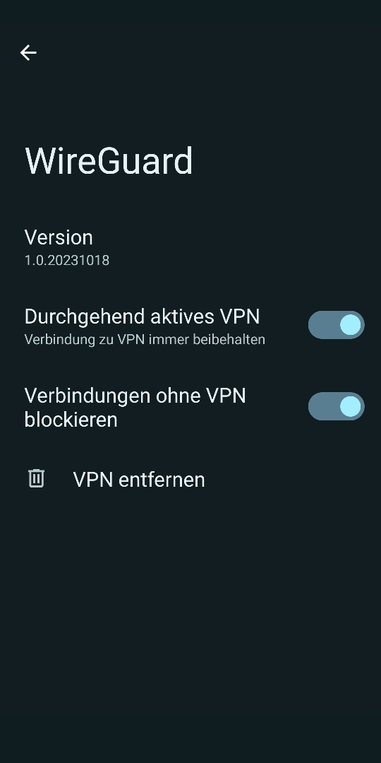 Ich hätte aber gerne die Einstellungen, wie du sie vorgeschlagen hast, zusätzlich mit „Erlaube Always-On VPN“ (WG Tunnel) und „Verbindungen ohne VPN blockieren“ (in den Android-Einstellungen „Netzwerk und Internet“ > „VPN“) kombiniert.